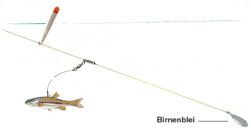 Montage mit Schwimmkörper: Eine aufschwimmende Styropor Kugel oder auch eine leere Wasserkugel läßt den Köder schweben. Die Größe des Schwimmkörpers muß dem Gewicht des Köders angepaßt werden. Das Birnenblei hält die Montage am Gewässerboden fest. Natürlich darf der Schwimmkörper nicht das Blei vom Grund aufheben. |