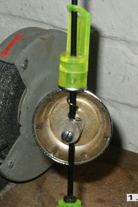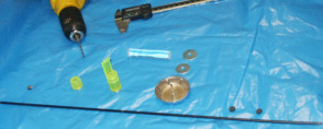 Das wird benötigt: 1 Affenkletterer - 2-teilig 1 Deckel einer Fahrradklingel (abziehbar) 2 Unterlegscheiben – Außendurchmesser des „Affen“ eine Spiralfeder 1 Stck. 15 mm d x 25 mm lg. Rundmaterial (ich habe hier Plexiglas) 1 Schraube M 4 x 20 mm 1 Stck. M 4 Gewindebohrer, 1 Bohrmaschine, 3,5 mm und 4,5 mm Bohrer |