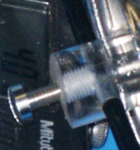 Das fertiggebohrte Rundmaterial wird auf die Kletterstange aufgesteckt und mit der M 4 Schraube festgeklemmt oder geklebt. (Sekundenkleber) . Der Klingel-deckel eingesteckt und festgeklebt. (Sekundenkleber) –der Klingeldeckel darf die Kletterstange nicht berühren. |
