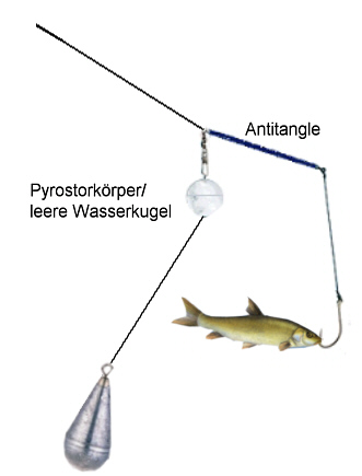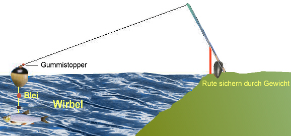 Es bietet sich immer bei schweren Montagen an, den Knoten vor dem Wirbel auf der Hauptschnur vor z.B. freilaufenden Teilen zu schützen. Daher die Gummiperle vor dem Wirbel auf der Hauptschnur.